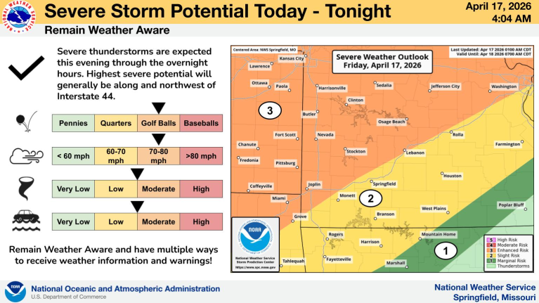 The biggest threats will be wind, hail and possible tornadoes.