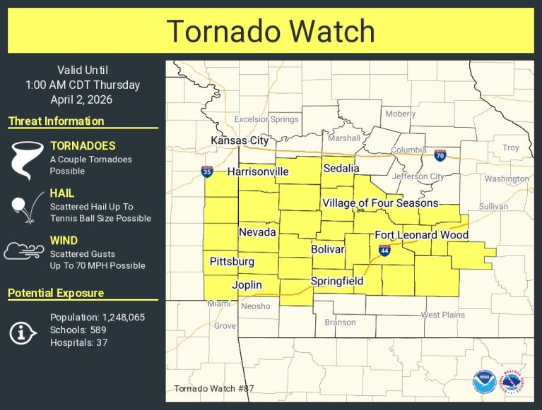 A tornado watch has been issued for parts of Kansas and Missouri until 1 AM CDT