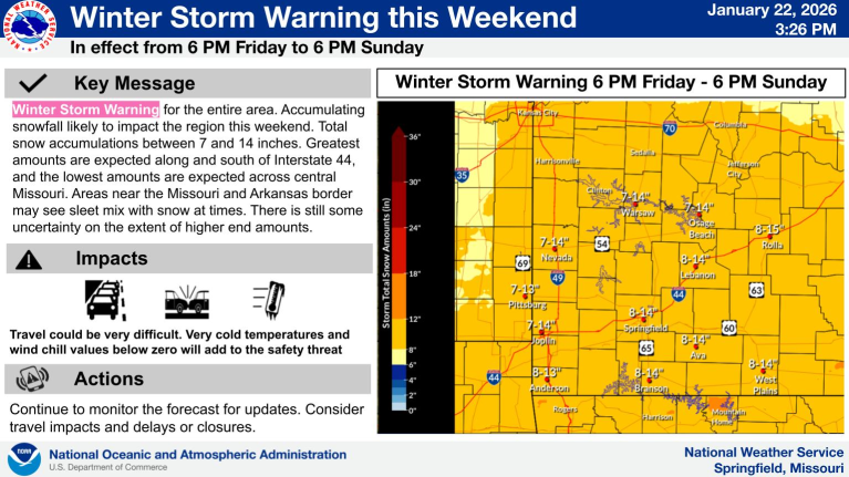 * WHAT…Heavy snow expected. Total snow accumulations between 6 and 12 inches. Greatest amounts are expected along and south of Interstate 44 and the lowest amounts are expected across central Missouri. Areas near the Missouri and Arkansas border may see sleet mix with snow at times.